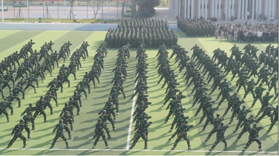 军体拳方队的男生动作强劲有力,拳拳相接,精神气十足,弓步冲拳、穿喉弹踢等一系列动作行云流水;匕首操方队的女生巾帼不让须眉,手持“利刃”披荆斩棘,弓步上刺、闪身反刺等动作规范整齐,声音响彻云霄;战术方阵的同学们动作迅速敏捷,协调一致,随着教官口令的下达不断变换队列战术,充分体现出电信学子严谨细致、刻苦耐劳的良好品质。